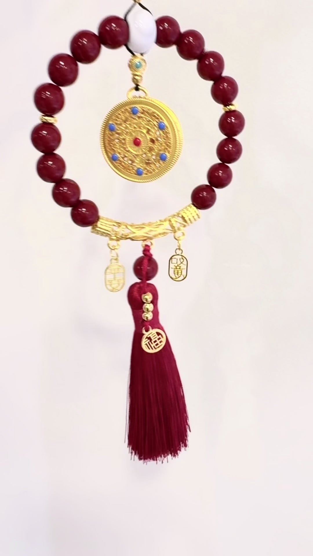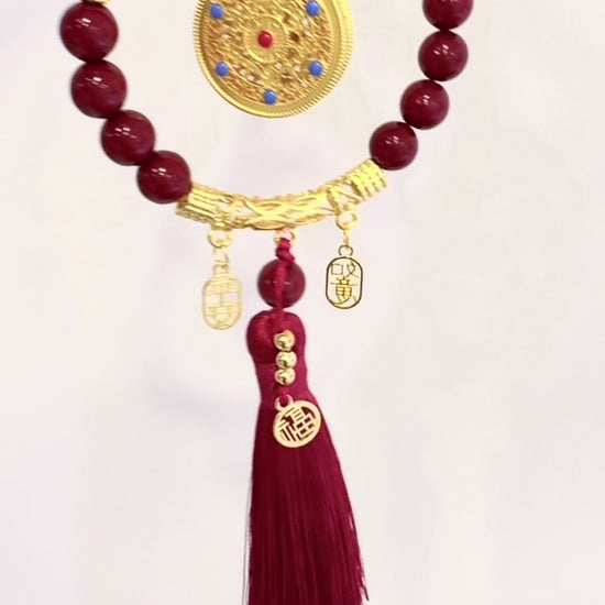 Médaillon central doré : représente un talisman de chance ou une roue de richesse